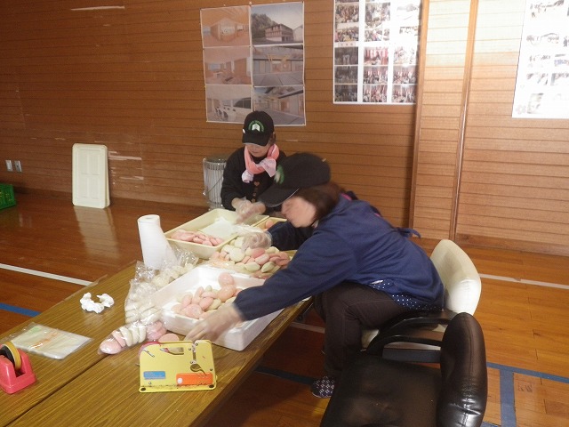 女性陣はまずは婦人部の販売準備のお手伝いで公民館での餅の袋入れ作業。