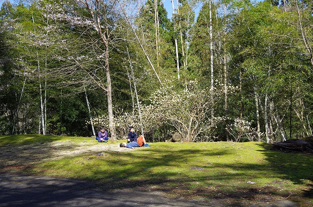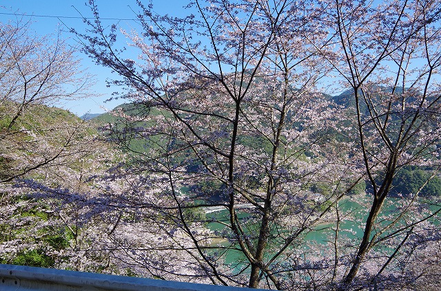 一回目の休憩場所では、桜と湖と山の緑のコントラスト