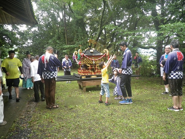 大人神社に移動し、神楽奉納のときには小雨になり、神事のときにまた降り出し、神輿担ぎが出発すると雨もやみ、終盤には薄日が差してきました。これぞ大人の力。