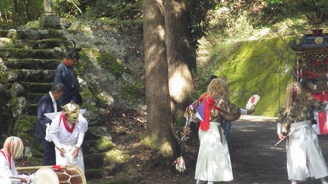 ご神体の入った神輿の順で、神楽を舞いながら行進します。