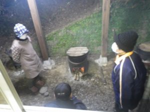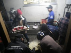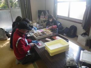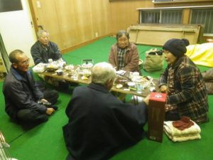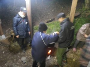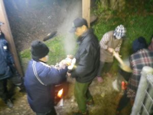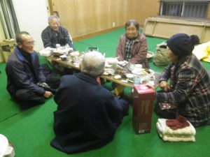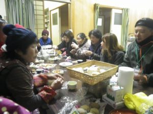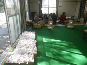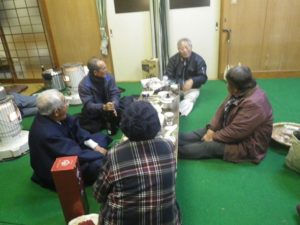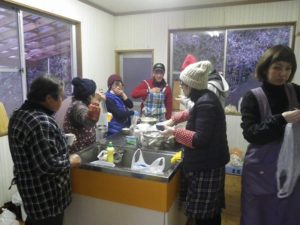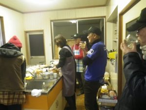 この日の女性は私ひとり、センターで煮しめつくりなどの準備のお手伝いです。今回のセンター付は昨年の南川神楽でお世話になりました梅ノ木集落の婦人部の皆さんです。夕食、夜食、朝食と翌朝までセンターでお客さんに食事を出してくださいます。私たち九州つなぎ隊は梅ノ木婦人部のお手伝いです。
