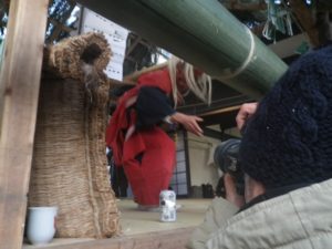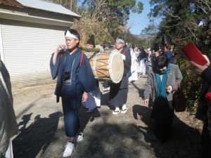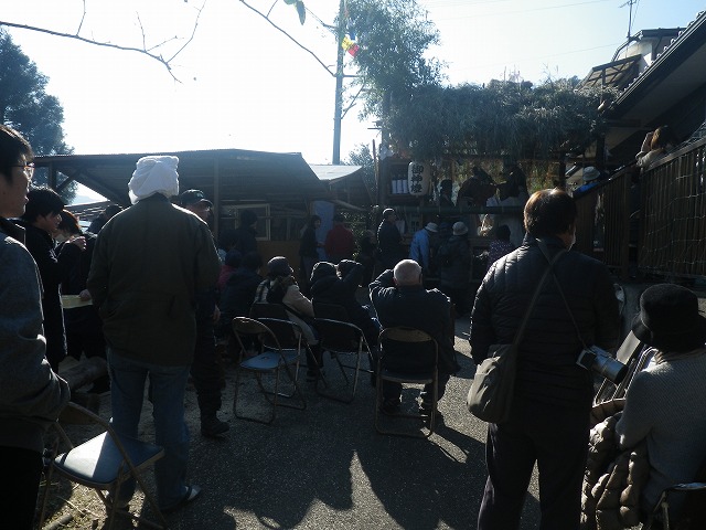 みこやが建ち上がり、舞い手たちは昼食を済ませ、一旦着替えに戻られます。そして昼過ぎに集合し、松原神社で神事を行い、舞入れが始まります。