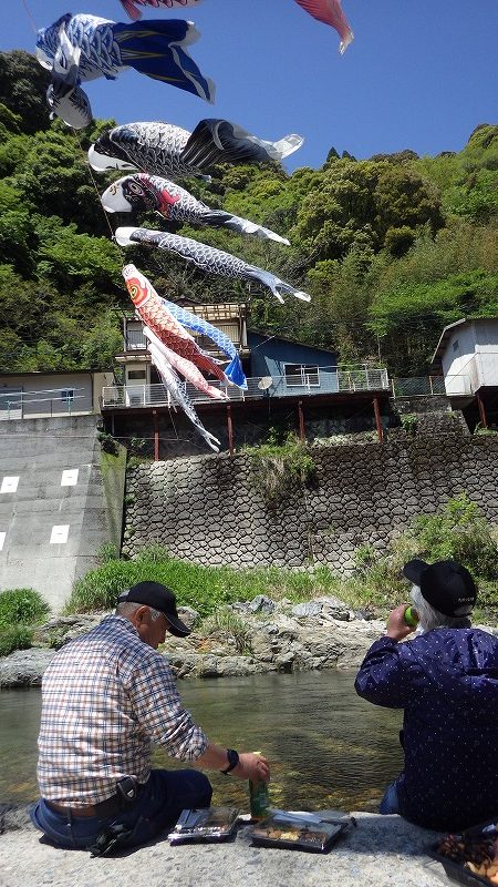 終了後は鯉のぼりが泳ぐ河原に下りての昼食でした。
