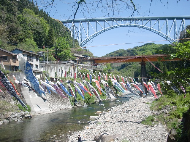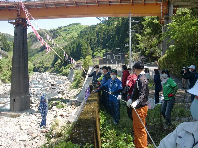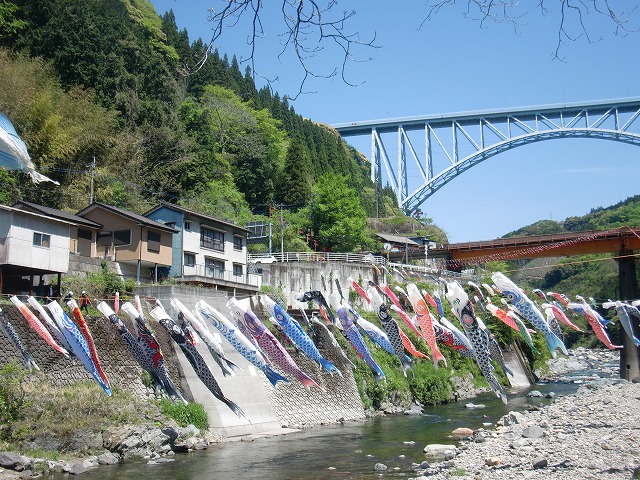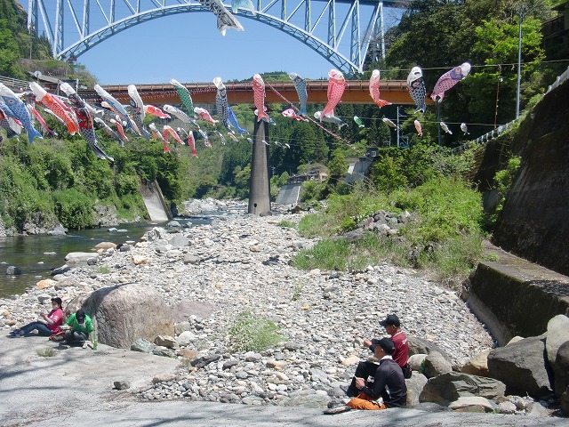 本年も、九州つなぎ隊の皆様や、地域おこし協力隊、集落支援員、青年部OB、商工会職員など様々な方々の御協力により、日之影川に鯉のぼりを掲揚することができました。