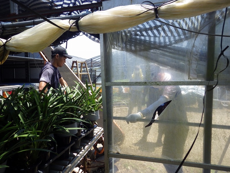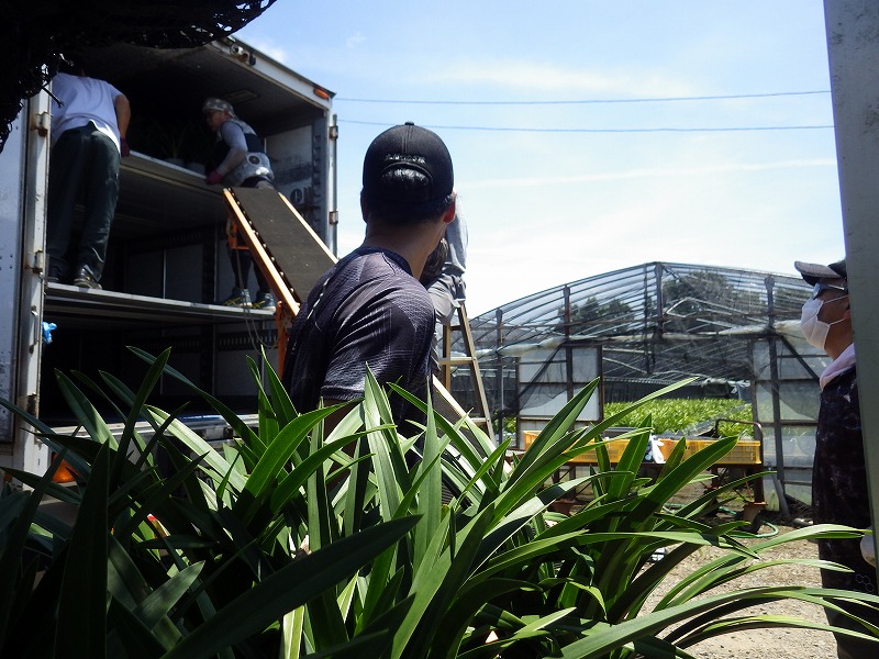 この日も夏らしい天気の中での作業。ハウスの中でマスクをしての作業(とはいえ外側は風通しのいい網です。)、体を汗が流れます。