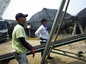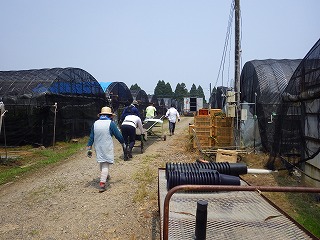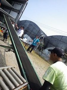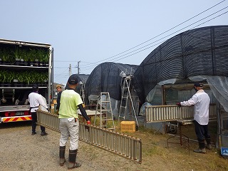 まずは10トントラックから始めます。ビニールハウスの中は横から風が入るようにはなっていて通気性はいいのですが、いつのまにか体も顔も汗まみれです。作業の合間に外に出るとおそらく結構な気温で暑いのでしょうが、涼しさを感じます。水分補給を合間にはして、約3時間弱で作業は終了しました。