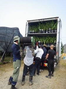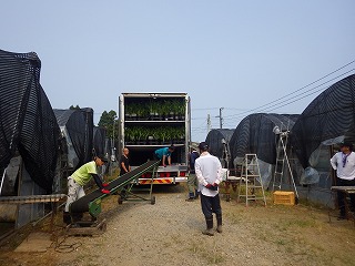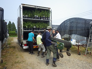 シンビジウムをトラックに積み込む作業です。10トン1台、4トン2台に積み込みます。