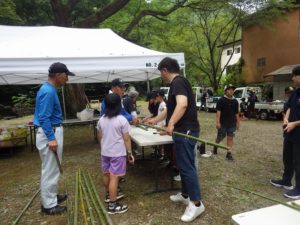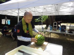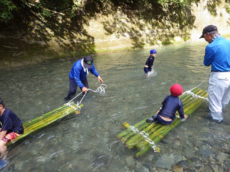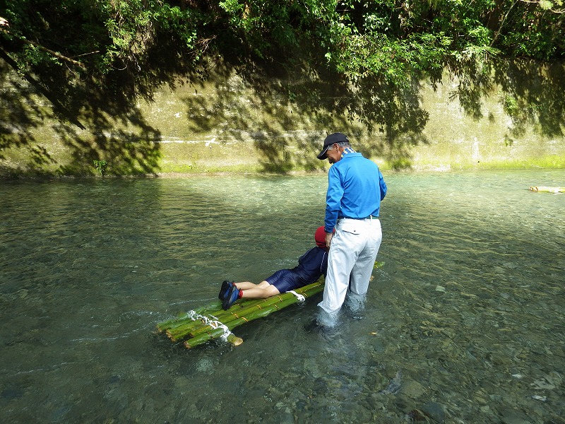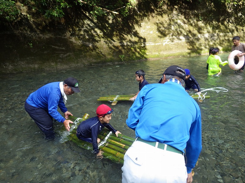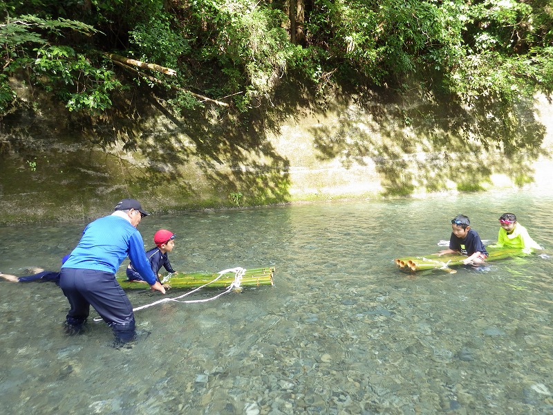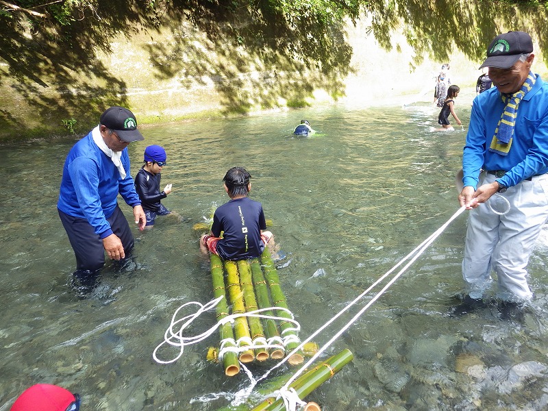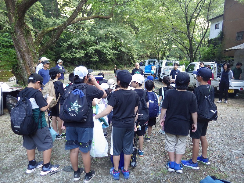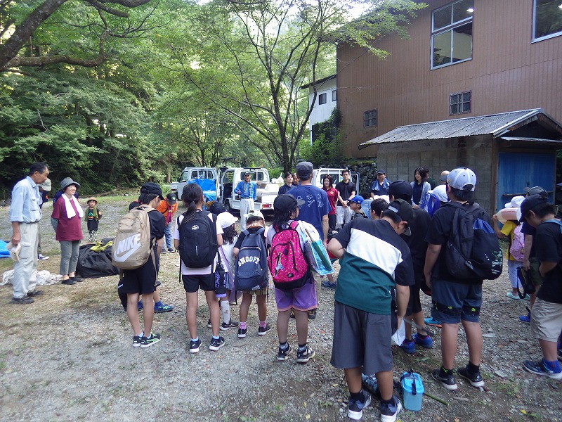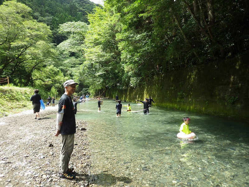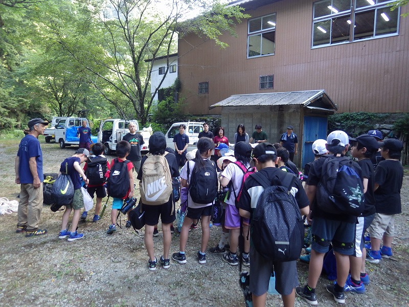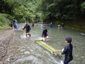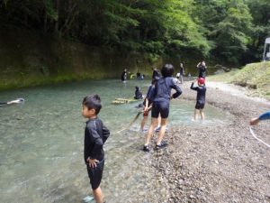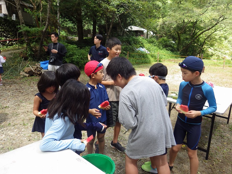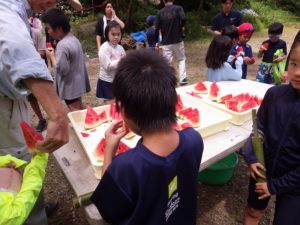 しかし やまじゅう倶楽部の大人たちがこの日のプログラムを考えてくれてその行程で進んでいきます。まずは班組。水鉄砲作り。そしてできた水鉄砲で水を掛け合って遊びます。水分補給のスイカを食べて、いよいよ川遊びの始まり~始まり~