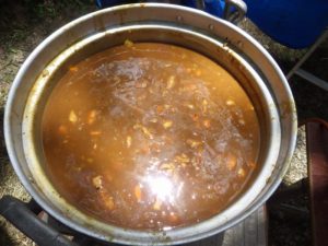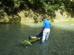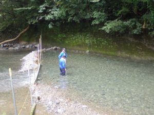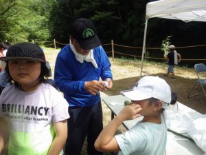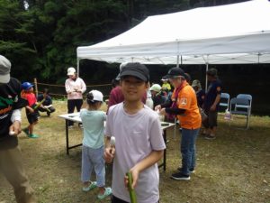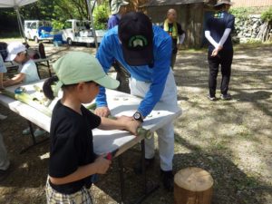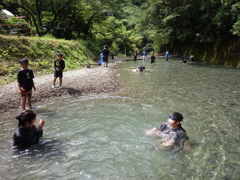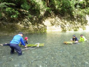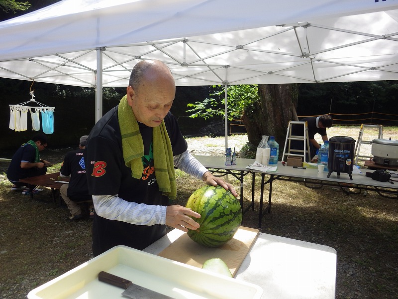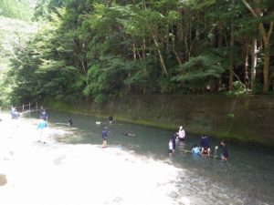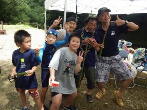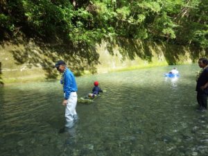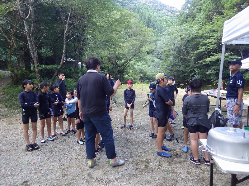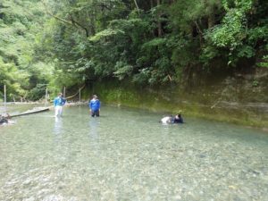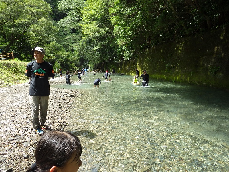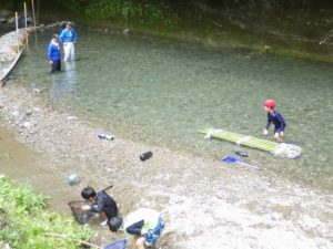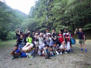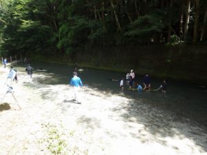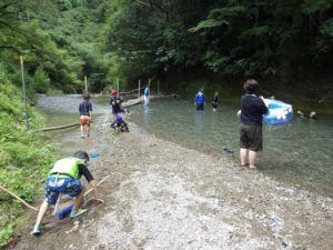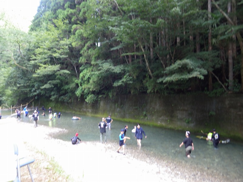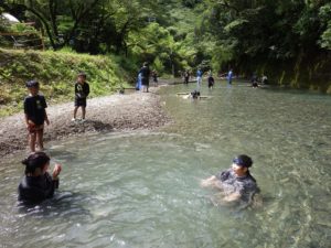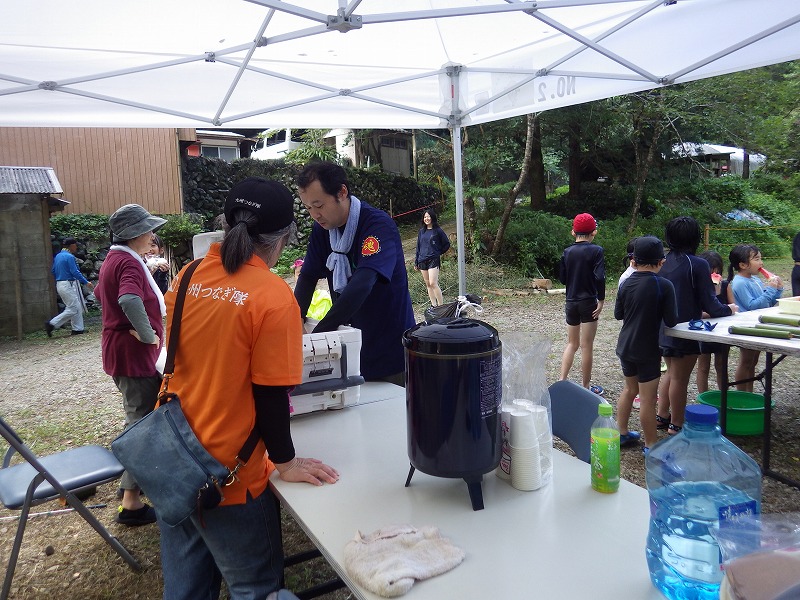 九州つなぎ隊は今年もまた参加してくれた三股町からのOがっちゃんと延岡市の神本さんが川下で川に入ってこどもたちを見守ってくれています。女性隊員は昼のカレー作り、おにぎり作りです。お腹を空かせたこどもたちは昼食のカレーを何杯もお替りしていました。