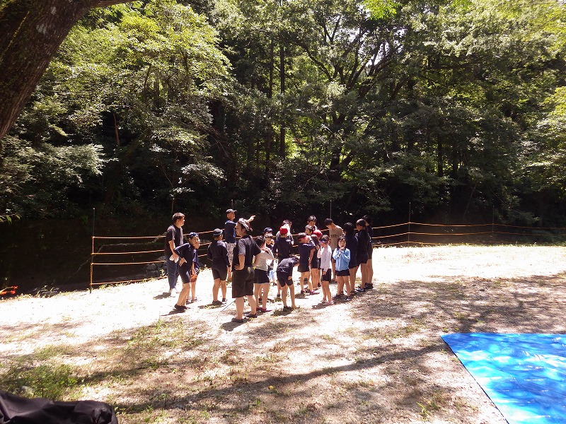 川の水は結構冷たく、体の冷えたこどもたちのために焚火が用意されています。冷たい川で思いっきり遊び、休憩タイムで焚火で体を温め、逆サウナを繰り返し、楽しい楽しい夏の一日は暮れていくのです。遊んだ後にはおにぎり、スイカ、お菓子を食べて、関わってくれた大人たちにお礼の言葉を伝えて、帰りのバスに乗り込み、楽しかった1日の終わりです。