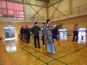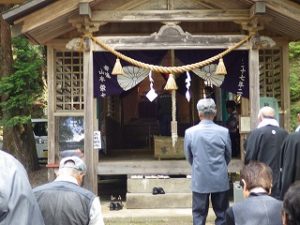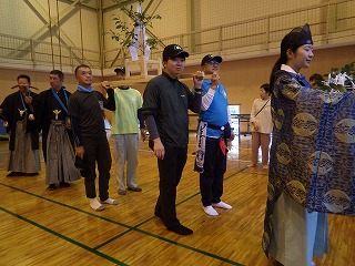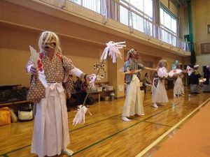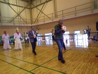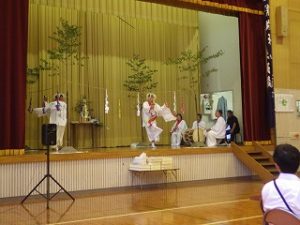 この祭りの日は雨の予報。なので神事のみ神社で行い、行列もその後の直会も旧立岩小学校の体育館での開催となりました。去年も雨で体育館だったよな~と思いつつ。(@_@)
