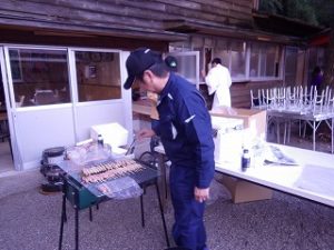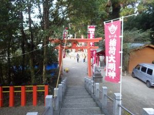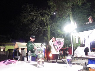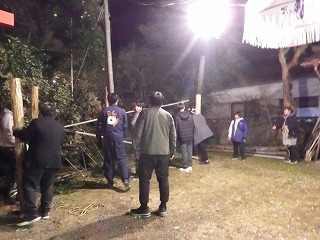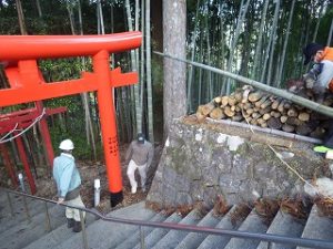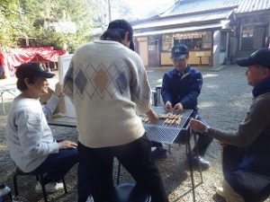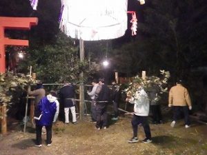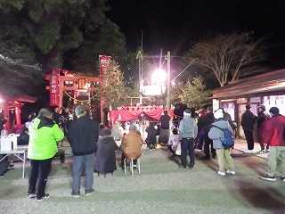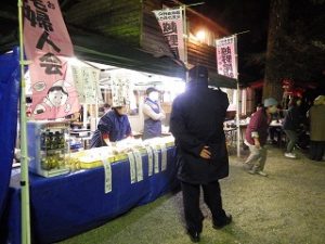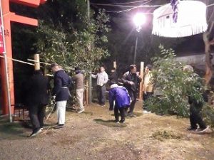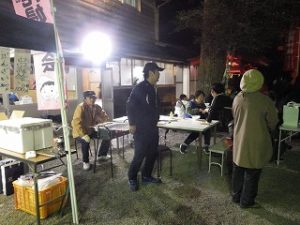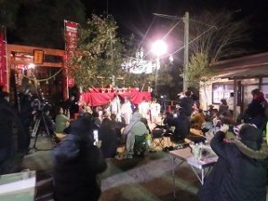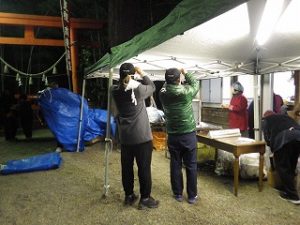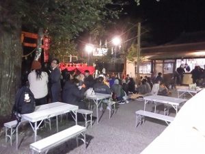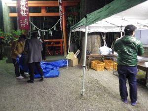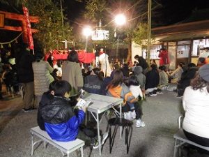 午前中 九州電力の皆さんは出店の設営の最終仕上げ。私とI藤さんは婦人部でのいなり寿司づくりのお手伝い。午後からはいよいよ出店で品出しなどの準備をして夜からの神楽開始に備えます。あたりが暗くなりはじめ、神様も降りて来てくださり、社人のみなさんが直会をされ、いよいよ神楽の始まりです。