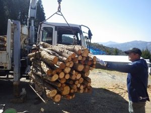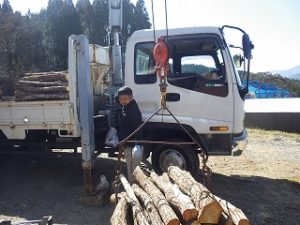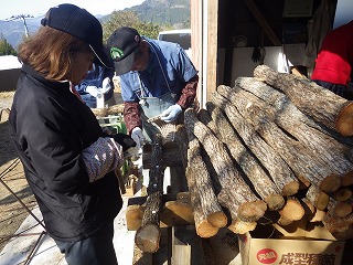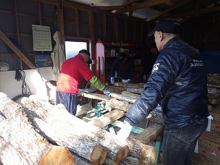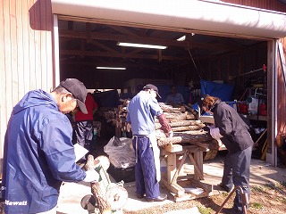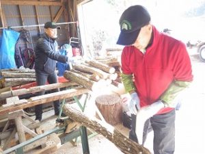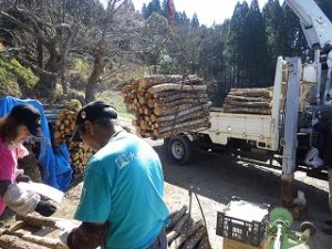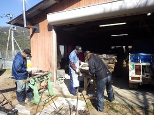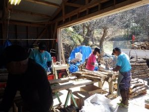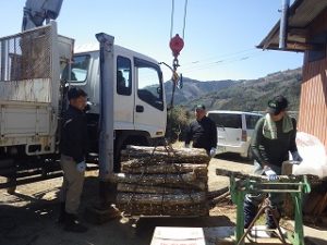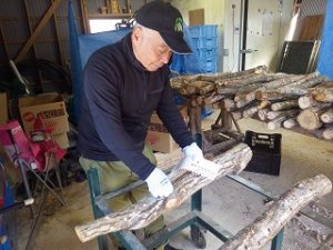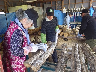 この日は雲一つない青空で、その分朝のうちは寒い。山から切り出され、多少乾燥している原木に奈須さんが直径1センチ程度の穴を機械で開け、そこにカプセルに入っているしいたけの菌を1つずつ入れていくという作業です。今回参加の隊員のうち4名は前回も参加されていて、初参加の私とは違い、手慣れています。作業は会話をしながら進みます。この日は木城町中ノ又地区からスーパーハルオも参加してくださり、自らもしいたけ栽培をされているスーパーハルオさんは自分とは違うこともありで何か得るものもあったのではないでしょうか。