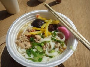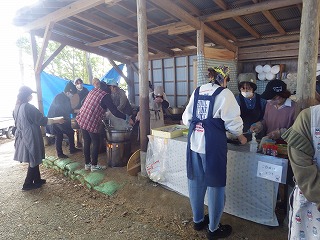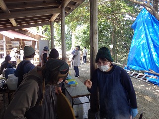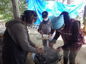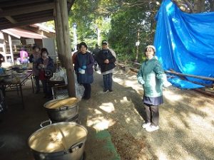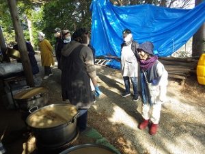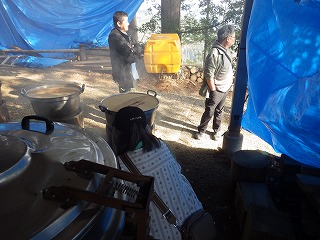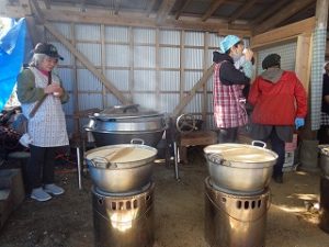 一方女性隊員の皆さんは神社までの果てしない階段を上がり、南川地区のご婦人方の運営されるうどんやさんに合流しました。うどんをゆでる窯の火の番などをして、開店時間を待ちます。