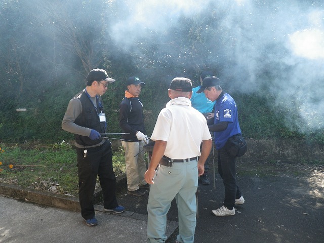 男性隊員の皆さんは地鶏を炭火で焼くお手伝い。